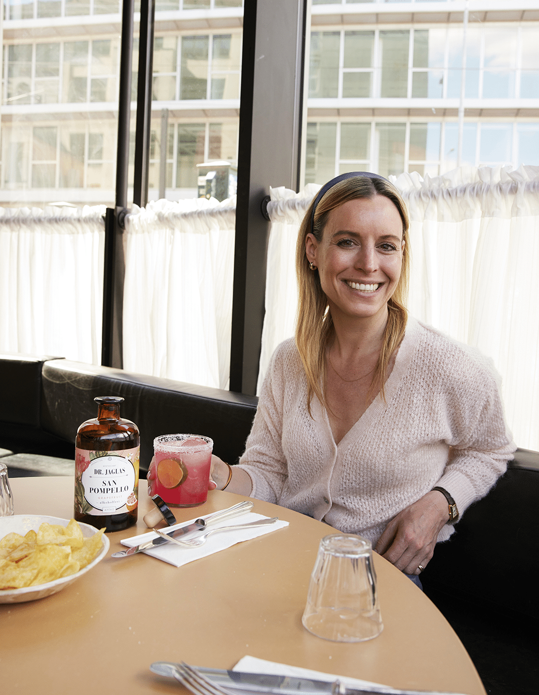 “Grapefruit in het Italiaans: pompelmo. Maar dan verbasterd alsof we er limoncello van gaan maken. Pompello. De toevoeging ‘San’ kreeg Marco van Basten pas toen hij in Milaan ging voetballen. Dr. Jaglas doet daar niet zo moeilijk over, en doopt zijn grapefruit spirit direct om tot San Pompello. Dr. Jaglas maakt behalve deze apéro ook een San Limello (alcoholvrije limoncello) en Herber Hibiskus (een soort alcoholvrije Aperol). En logischerwijs maak je daarvan een Limello Spritz of een Hibiskus Spritz. Eveneens in de combinatie met tonic maak je van de San Pompello de ‘Paloma Spritz’. En nu komt het… van de drie is dit de beste.
